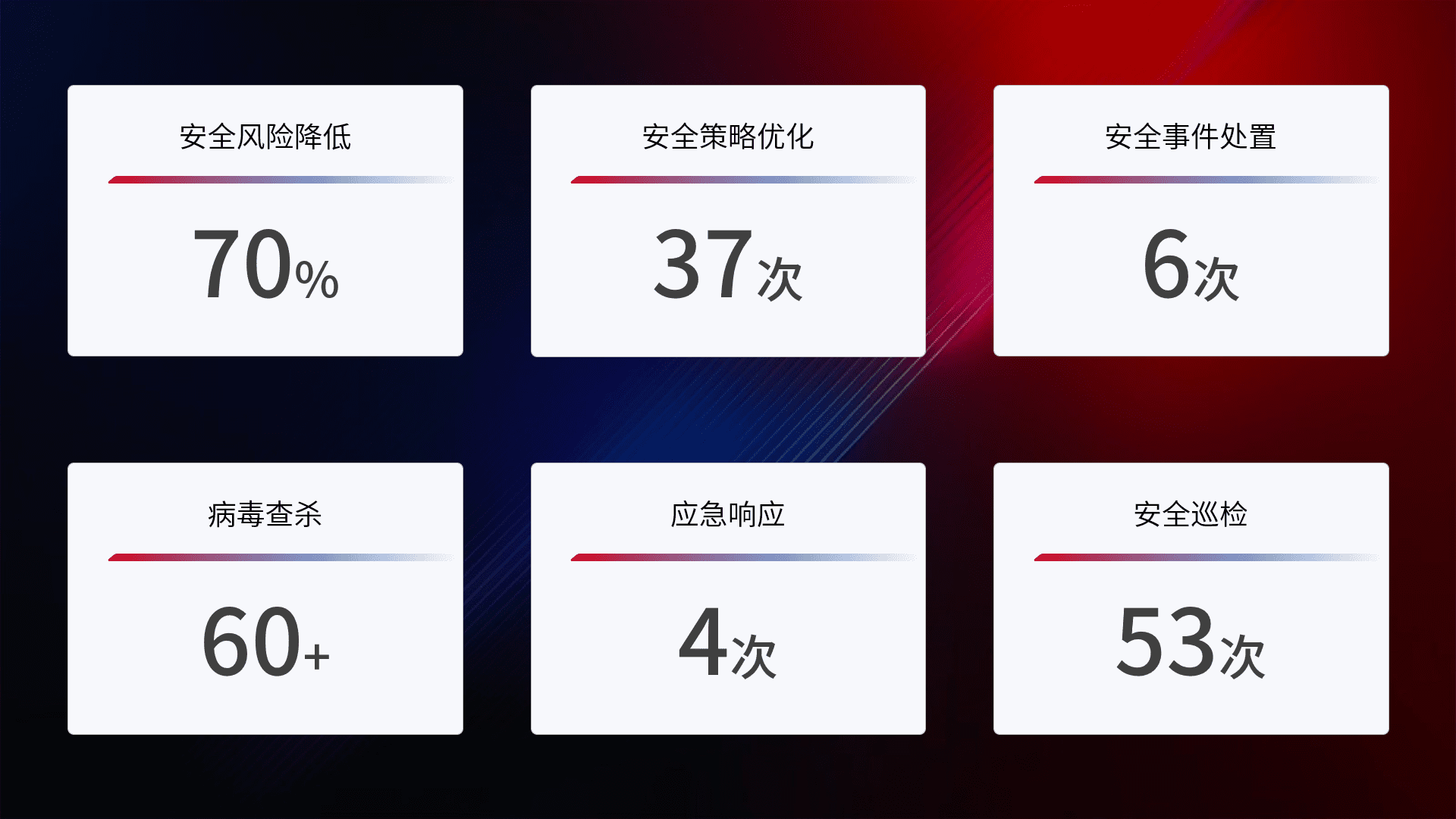 提供全面的安全事件报告体系,,,包括处置报告、、周报、、、季度和年度总结,,结合持续监控,,,,帮助客户深入了解网络安全状况。。。。