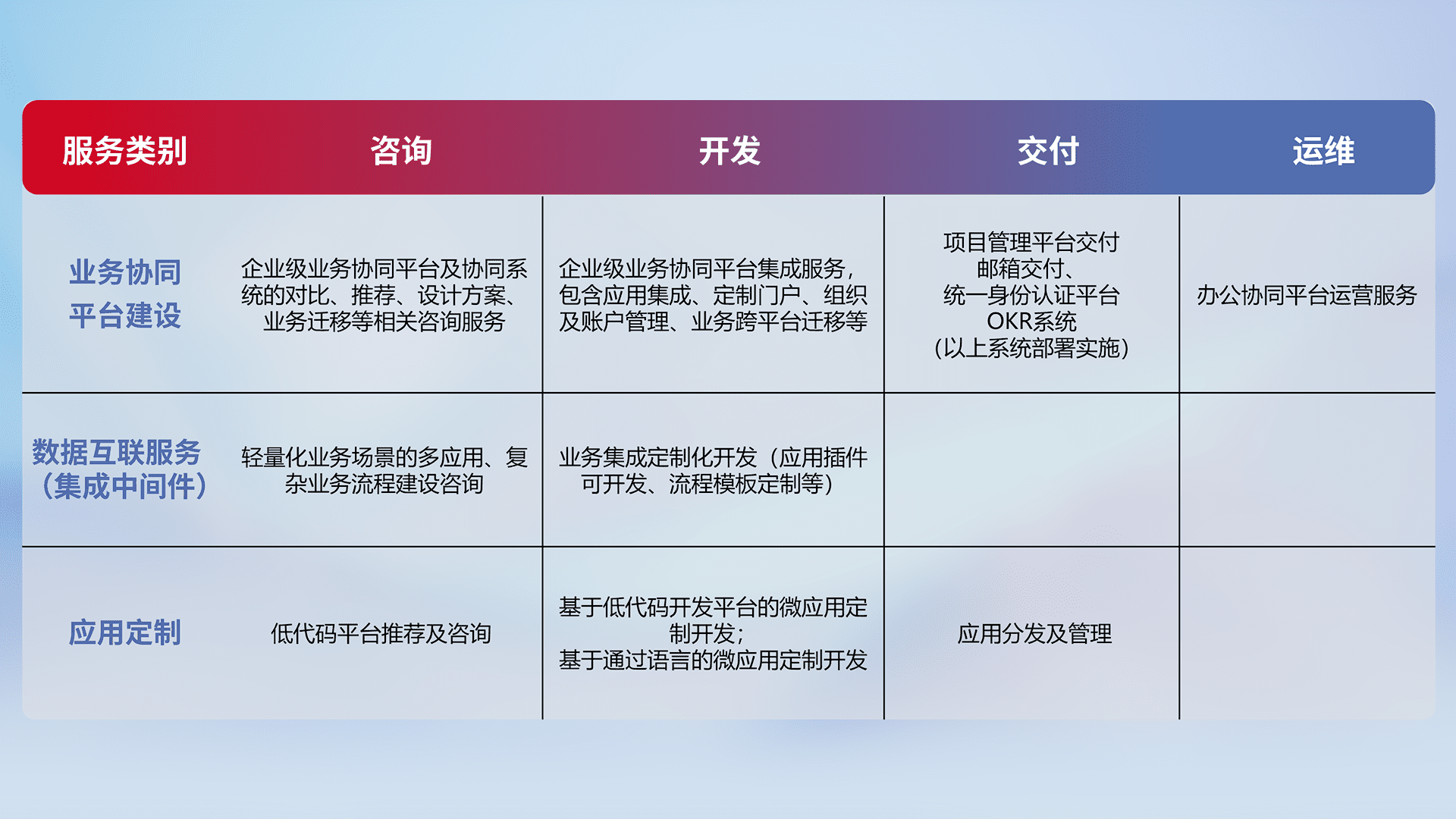 针对钉钉、、、企微、、、IDaas等平台级产品提供产品的规划、、、、方案、、、交付、、、、定制化开发等服务,,,实现如统一协同办公、、、智能客户服务、、混合会议管理、、、智能数据查询、、等业务场景,,,实现数字化转型。。。。